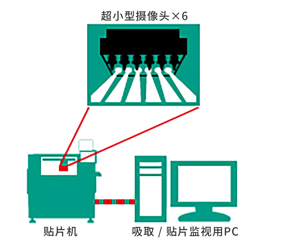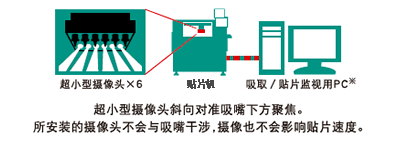 安装在贴装头上的新开发超小型摄像头可以 实时拍照并保存部件的吸取、搭载动作。 在发生了不良时, 根据已保存的图像数据实现通过目视来进行不良原因分析。